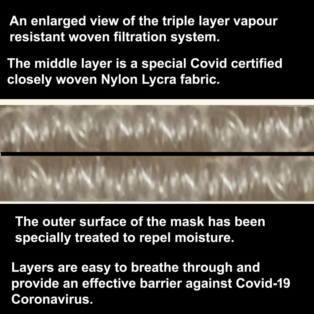 Comprises a water-resistant woven outer layer, a finely woven Lycra middle layer and a further woven inner layer to create a maze of highly breathable virus-resistant protection.